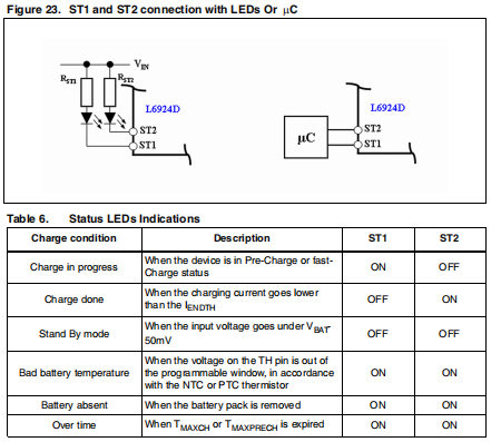 为了指示各种充电器状态,有两个集电极开路输出引脚,ST1和第二章。这些状态引脚可用于驱动与外部连接的状态指示灯电源,通过电阻,或与主机处理器通信。这些针决不能当它克服绝对值(6V)时连接到VIN。