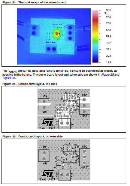 热回路将装置保持在大约120°C的恒定温度,这转弯,减少ICHG。但是,为了最大限度地提高当前的能力,重要的是确保良好的热路径。因此,暴露的焊盘必须正确焊接到通过热通孔与另一层连接。推荐的铜层的厚度为70μm或更高。裸露的焊盘必须与GND进行电气连接。图24显示了功耗为1W的电路板。在这种情况下,外壳的温度为89°C,但器件的结温由下式给出:当安装在船上的装置的RTH J-A为75°C/W时,消耗的功率为1W,并且环境温度为25°C。在这种情况下,结温为:TJ=RTHJ−A×PDISS+TAMB公式TJ Co=75×1+25=100当量