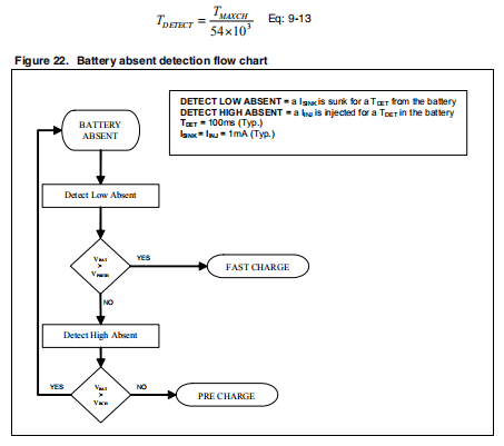 此功能提供电池缺失检测方案来检测移除或插入电池的。如果拆下电池,充电电流将低于IENDTH。在结束时去故障时间,检测电流IDETECT,等于1mA,从输出处下沉一段时间t检测。该装置检查输出端的电压。如果低于VPRETH,则电流等于将toidetect注入输出电容器进行t检测,并检查输出电压高于VABS(值为VOPRGTH-50mV)。如果电池在检测时间内,电压从VPRETH变为VABS,反之亦然,这意味着电池与充电器连接。t检测值表示为: