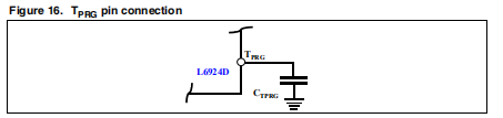为了避免长时间对一个没电的电池充电,L6924D有可能从快速充电阶段开始设置最长充电时间。这个计时器可设置电容器,连接在TPRG引脚和GND之间。CTPRG是外部电容器(单位:nF),由以下公式得出:
