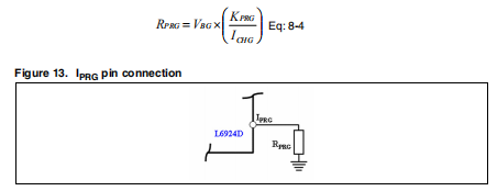 当电池电压达到预充电电压阈值(VPRETH)时,L6924D开始快速充电阶段。在这个阶段,设备用恒定的电流,ICHG,可由外部电阻器编程,该电阻器用准确度为13%。用于选择RPRG的公式如下: