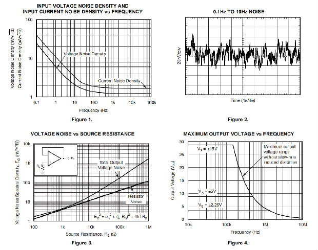 低噪声运算放大器电路的设计需要仔细考虑各种可能的噪声因素:来自信号源的噪声、运算放大器中产生的噪声以及来自反馈网络电阻器的噪声。电路的总噪声是所有噪声分量的平方根和组合。