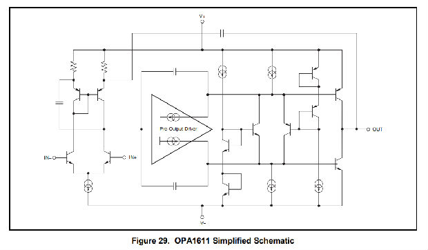 OPA1611和OPA1612是单位增益稳定、精度很低的运算放大器;这些器件也没有输出相位反转。噪声或高阻抗电源的应用要求去耦电容器靠近设备电源引脚。在大多数情况下,0.1μF电容器就足够了。图29显示了OPA1611的简化内部示意图。