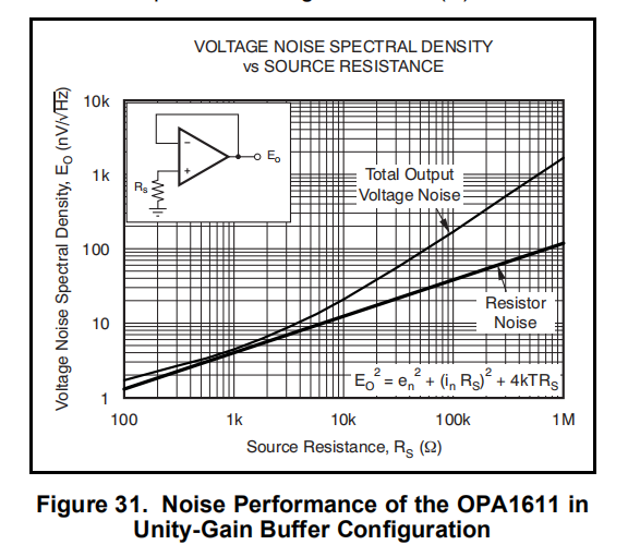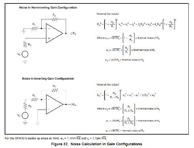 源阻抗的电阻部分产生与电阻平方根成比例的热噪声。图31描绘了这一点功能。The源阻抗通常是固定的;因此,选择运放和反馈电阻,以尽量减少各自对总噪声的贡献。