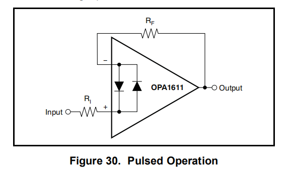 如图30所示,OPA1611和OPA1612的输入端子采用背靠背二极管进行保护,以防差动电压过高。在大多数电路应用中,输入保护电路没有后果。然而,在低增益或G=+1电路中,由于放大器的输出不能对输入斜坡做出足够快的响应,所以快速斜坡输入信号可以使这些二极管向前偏移。典型特征图17说明了这种影响。如果输入信号足够快,足以产生这种正向偏置条件,则输入信号电流必须限制在10mA或以下。如果输入信号电流没有固有的限制,可以使用输入串联电阻(RI)和/或反馈电阻器(RF)来限制信号输入电流。该输入串联电阻器降低了OPA1611的低噪声性能,并在下面的噪声性能部分进行了检查。图30显示了当输入端均使用限流电阻配置时的电流反馈和30。