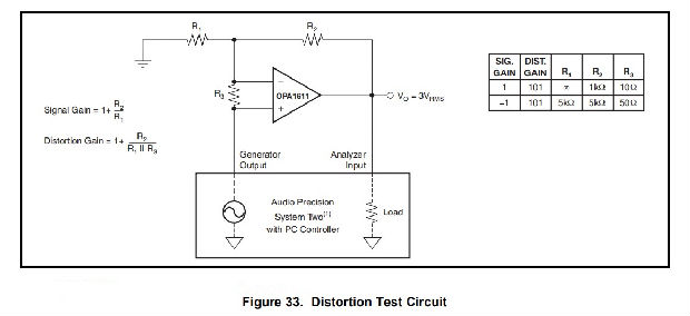 OPA1611系列运算放大器产生的失真低于许多市售失真分析仪的测量限值。但是,可以使用特殊的测试电路(如图33所示)来扩展测量能力。