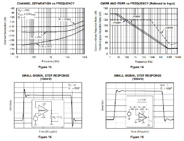 OPA161x系列运算放大器具有优良的失真特性。在20Hz至20kHz的音频频率范围内,THD+噪声低于0.00008%(G=+1,VO=3VRMS,BW=80kHz)(特性性能见图7)。