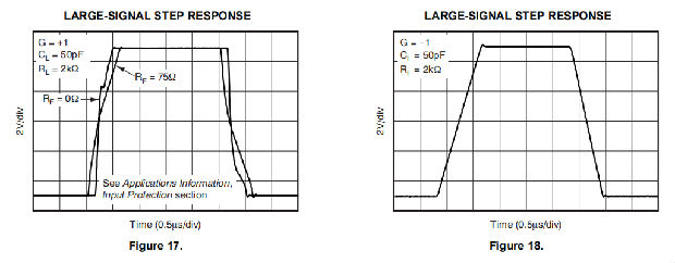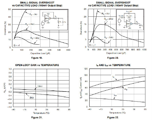 这个小的串联电阻也可以防止过多的功率消耗,如果设备的输出变短。图19和图20所示为几个RS值的小信号超调与电容性负载的关系图。有关分析技术和应用电路的详细信息,请参阅应用公告AB-028(文献编号:SBOA015,可从TI网站下载)。