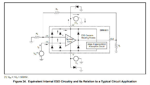 当运算放大器连接到如图34所示的电路中时,ESD保护组件将保持非活动状态,而不会涉及到应用电路中手术。但是,当外加电压超过给定引脚的工作电压范围时,可能会出现这种情况。如果出现这种情况,则存在一些内部ESD保护电路可能偏压并传导电流的风险。任何这样的电流都是通过导向二极管路径产生的,很少涉及吸收装置。