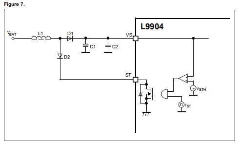 使用中所示的其他部件,可以将工作蓄电池电压范围扩展到6V图7。一个L~150μH(Ipeak~500mA)的小电感器与电池电源串联,构成一个升压转换器开关开路漏极输出ST。开关频率为典型的100kHz,固定占空比为50%。升压转换器在VVS<8V以下启动,增加VS引脚的电源电压并关闭在VVS>10V时,以避免在标称电池电压下出现EME。二极管D2与ST引脚串联是必要的对于蓄电池电压为负的系统。升压转换器不能驱动任何附加负载。