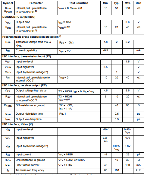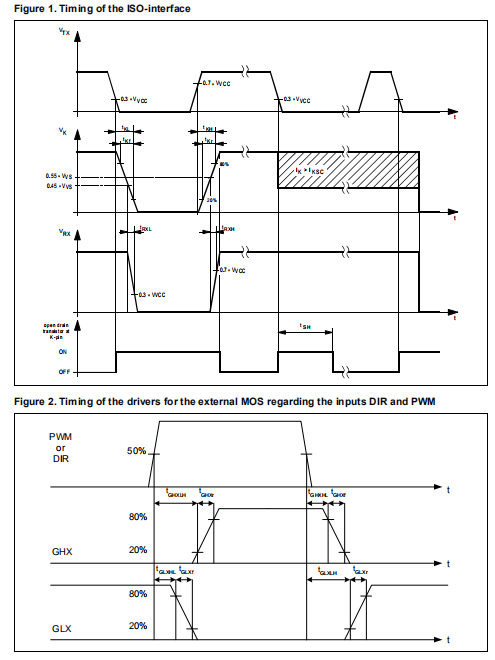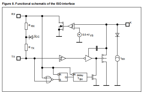 ISO接口提供微控制器和串行总线之间的通信,具有波特率通过VBAT和GND兼容的单根导线,最高可达60kbit/s。逻辑电平传输输入TX驱动开漏K输出。K输出可以通过上拉电阻连接到VBAT的串行总线上。K 引脚具有过压保护,对GND和VS短路,并且可以在VVS和GND之外驱动。缺乏时VVS或GND的输出显示高阻抗特性。具有内部拉的开漏极输出RXup电阻器监控K引脚的状态,以读取接收到的数据并控制传输的数据。短如果内部开路漏极晶体管不能拉动电压电势,则可识别K引脚处的电路状况在K引脚低于0.45·VVS阈值时。然后RX保持在高状态。计时器启动并切换开路漏极晶体管。关闭20μs。TX输入的下一个低电平会重置定时器和开漏晶体管再次打开。