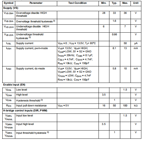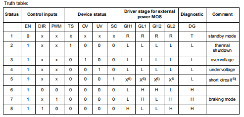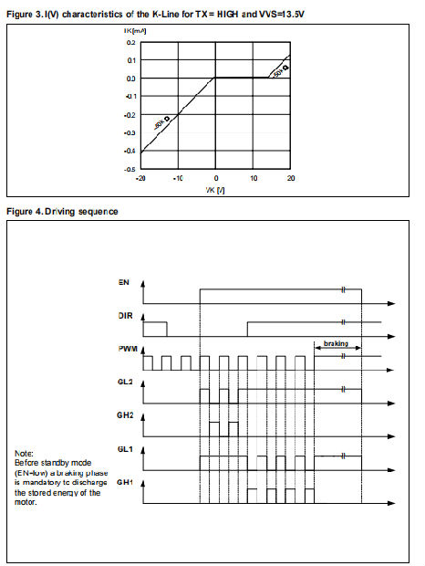 cmos电平输入驱动如图4所示和真值表中所述的器件。通过启用输入高信号激活设备。对于启用输入浮动(未连接)或VEN=0V设备处于待机模式。当激活设备时,建议50μs的唤醒时间来稳定内部供应。DIR和PWM输入控制外部H桥晶体管的驱动器。电机方向可以是用DIR输入选择,用PWM输入选择占空比和频率。定义了未连接的输入通过内部上拉电阻器。在唤醒和制动期间以及通过禁用IC之前,启用两个输入应该开得很高。