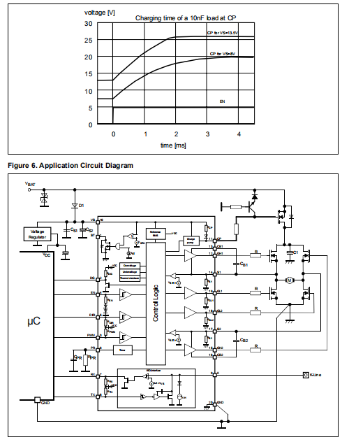 如图6所示,可使用外部N沟道MOS晶体管实现反向电池保护。在这种情况下,它的漏极体二极管提供保护。输出CP用于驱动晶体管的栅极高于电池电压,从而打开MOS,并用RDSON绕过漏极二极管。这个CP通过一个内部二极管和一个20kΩ电阻器与VS相连。用于外部N沟道功率MOS晶体管(GH1,GH2,GL1,GL2)的栅极驱动器EN的高电平在DIR和PWM输入的控制下激活外部MOS驱动器(见真相表和驱动顺序图4)。外部功率MOS门通过串联电阻连接到设备上,以减少系统的电磁发射(EME)。电阻影响开关行为。必须仔细挑选。电阻过大会增加电源的充放电时间MOS栅并能在半桥中产生交叉电流。驱动器保证更长的切换延迟时间从源到汇阶段,以防止交叉传导。栅极源电压限制为14V。充放电电流受驱动器的RDSON限制。司机们没有穿短裤的保护措施。