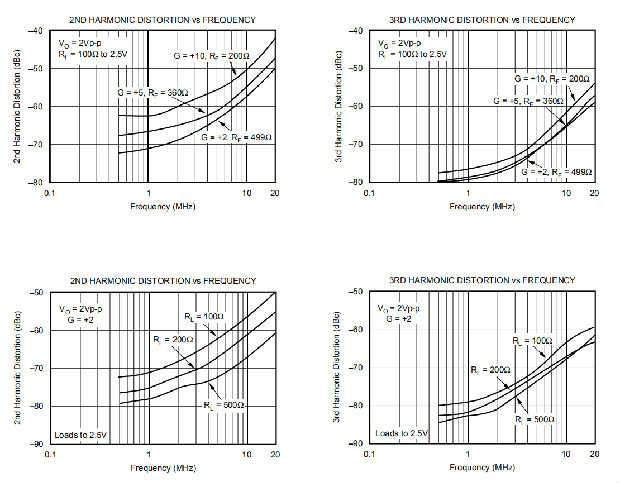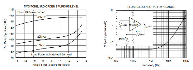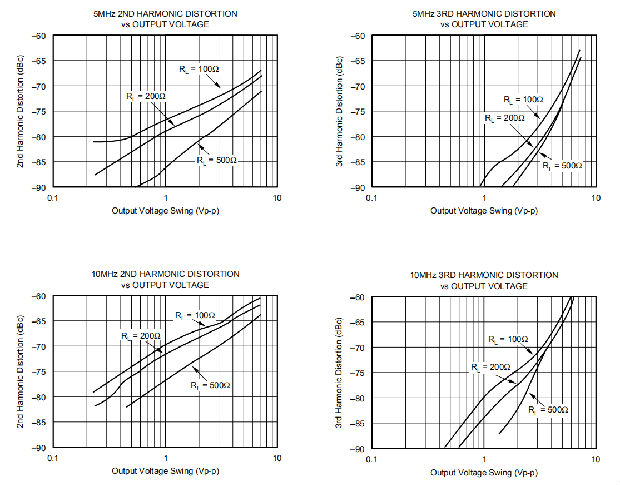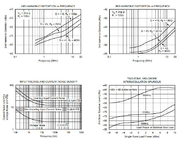 OPA2681在±5V电源的100Ω负载下提供良好的失真性能。与其他解决方案相比,它在较轻负载和/或在单个+5V电源上运行提供了优异的性能。一般来说,在基波信号达到非常高的频率或功率水平之前,二次谐波将主导失真,而三次谐波分量可以忽略不计。然后聚焦于二次谐波,增加负载阻抗直接改善失真。请记住,总负载包括反馈网络-在非反相配置(图1)中,这是RF+RG的总和,而在反向配置中,这只是RF。此外,在电源引脚之间提供额外的电源去耦合电容器(0.1μF)(用于双极操作)略微改善二阶失真(3到6dB)。