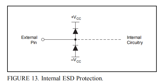 OPA2681是使用非常高速互补双极工艺制造的。对于这些非常小的几何器件,内部结击穿电压相对较低。这些细分反映在绝对最大评级表中。如图13所示,所有设备引脚都有有限的ESD保护,使用内部二极管供电。