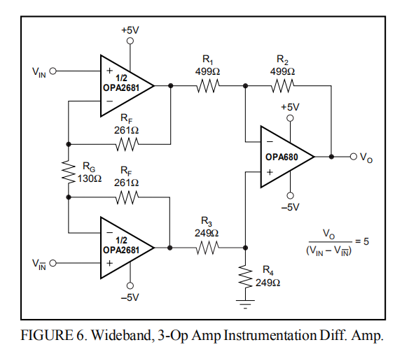 如前所述,随着信号增益的增加,OPA2681的电流反馈拓扑提供了几乎恒定的带宽。图6所示的三个运算放大器宽带仪表放大器利用了这一点,实现了160MHz的差分带宽。该信号应用于OPA2681的高阻抗非反相输入端。差分增益由(1+2RF/RG)设置,使用图6所示的值等于5。反馈电阻,RF,在这个特定的增益下被优化。可通过调整RG进行增益调整。差分到单端转换由配置为标准差分放大器的电压反馈放大器OPA680执行。为了保持OPA2681良好的失真性能,通过设置R3+R4=R1来匹配每个放大器输出的负载,而不是在差分放大器中使用相同的电阻值。