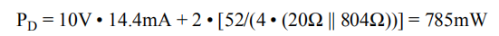 作为最坏情况的例子,使用图1电路中的OPA2681 SO-8计算最大TJ,该电路在最高规定环境温度+85°C下运行,两个输出驱动接地20Ω负载至+2.5V。