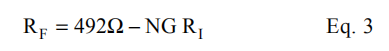 OPA2681经过内部补偿,在±5V电源的NG=2下,为RF=402Ω提供最大平坦的频率响应。给出了目标函数(49mpe2)的最优反馈。随着信号增益的变化,ngx-RI项在反馈互阻抗中的贡献也会发生变化,但通过调整RF可以使其保持不变。方程3给出了最佳射频过信号增益的近似方程: