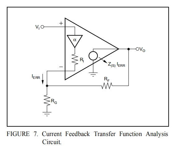 电流反馈运算放大器感测逆变节点中的误差电流(与电压反馈运算放大器的差分输入误差电压相反),并通过内部频率相关的跨阻增益将其传递到输出端。典型的性能曲线显示了这种开环跨阻响应。这类似于电压反馈运放的开环电压增益曲线。发展图7电路的传递函数得出方程式1:
