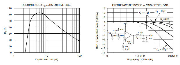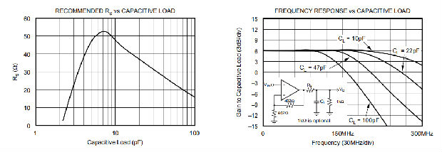 对运算放大器来说,最苛刻也是最常见的负载条件之一就是电容负载。通常,电容性负载是A/D转换器的输入端,包括额外的外部电容,这可能是为了改善A/D线性度而建议的。当电容性负载直接施加在输出引脚上时,像OPA2681这样的高速、高开环增益放大器很容易受到稳定性下降和闭环响应峰值的影响。当考虑放大器的开环输出电阻时,这种电容性负载会在信号通路中增加一个极点,从而降低相位裕度。有人提出了解决这个问题的几种外部解决办法。当主要考虑频率响应平坦度、脉冲响应保真度和/或失真时,最简单和最有效的解决方案是通过在放大器输出和电容性负载之间插入一个串联的隔离电阻,将电容性负载与反馈回路隔离。这并没有从环路响应中消除极点,而是将其移位,并在更高频率下添加零。附加零位的作用是消除电容性负载极的相位滞后,从而增加相位裕度,提高稳定性。