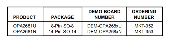 在使用OPA2681的两种封装风格下,有几个PC板可用于协助电路性能的初步评估。这两个都是免费的,作为一个不受欢迎的个人电脑板提供的描述性文件。下表显示了这些板的摘要信息。