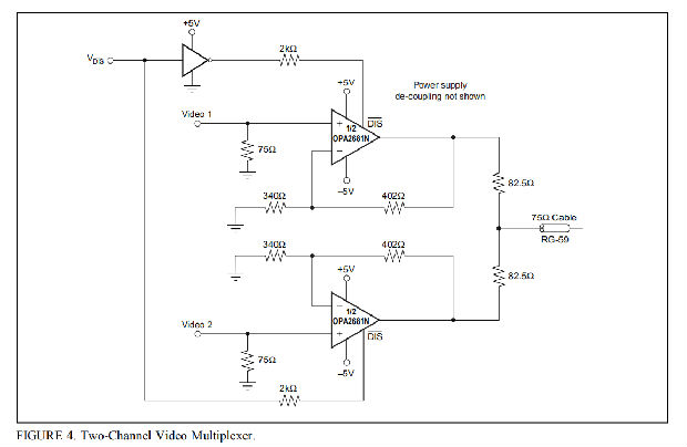 视频速度放大器(包括禁用管脚)的一个常见应用是将多个放大器输出连接在一起,然后从几个可能的视频输入中选择哪一个输入到一条线路上。这个简单的“有线或视频多路复用器”可以很容易地使用OPA2681N实现,如图4所示。