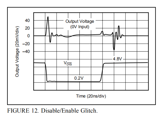 禁用操作中的一个关键参数是切换到禁用模式时的输出故障。图12显示了图1中输入信号设置为零伏时的这些故障。输出引脚处的故障波形与DIS引脚电压一起绘制。