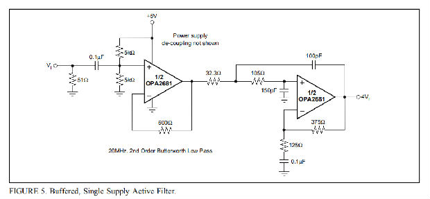 宽带电流反馈运算放大器是实现高速有源滤波器的理想元件,放大器被用作无源RC电路网络中的固定增益块。它们相对恒定的带宽和增益,提供了实际滤波器极点和放大器所需增益之间的低交互作用。图5显示了一个示例单电源缓冲过滤器应用程序。在这种情况下,OPA2681通道之一用于设置直流工作点,并提供从信号源到第二级滤波器的阻抗隔离。该级被设置为实现20MHz最大平坦巴特沃斯频率响应,并提供+4的交流增益。