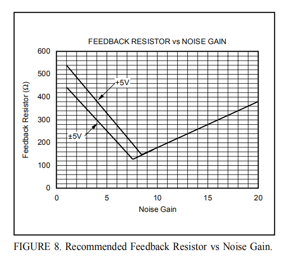 随着期望信号增益的增加,这个方程最终将预测一个负的射频。也可以通过将RG保持在20Ω的最小值来设置此调整的主观限制。较低的值将在输入级和输出级加载缓冲级,如果RF太低,实际上会降低带宽。图8显示了±5V和单个+5V操作的推荐RF与NG。此处显示的RF与Gain的值大约等于用于生成典型性能曲线的值。它们的不同之处在于,典型性能曲线中使用的优化值也对简化分析中未考虑到的板寄生进行了校正,从而得出方程3。图8中显示的值为需要带宽优化的设计提供了一个良好的起点。