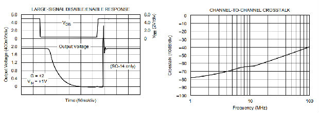 禁用操作部分显示了使用单通道接地输入的开启和关闭开关故障通常小于±50mV。当两个输出被切换时(如图4所示),由于“先通后断”的禁用定时,输出线始终由一个或另一个放大器控制。在这种情况下,两个0V输入的开关故障降至<20mV。