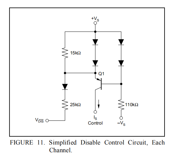 OPA2681N提供了一个可选的禁用特性,可用于降低系统功率或实现简单的信道复用操作。如果DIS控制引脚未连接,OPA2681N将正常工作。要禁用,控制引脚必须断言为低。图11显示了禁用控制功能的简化内部电路。