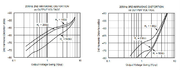 在大多数运算放大器中,增加输出电压摆幅会直接增加谐波失真。典型的性能曲线显示,2次谐波的增长率略低于预期的2倍速率,而3次谐波的增长率略低于预期的3倍速率。当测试功率加倍时,其与第二谐波之间的差值减小小于预期的6dB,而其与第三谐波之间的差值减小的程度小于预期的12dB。这也显示在2音三阶互调杂散(IM3)响应曲线。三阶杂散电平在低输出功率电平下极低。即使在基本功率达到非常高的水平时,输出级仍将其保持在较低水平。典型的性能曲线表明,杂散互调功率并不像传统截获模型所预测的那样增加。随着基本功率水平的增加,动态范围不会减小很明显。为了以20MHz为中心的2个音调,10dBm/tone进入匹配的50Ω负载中(即负载处的每个音调为2Vp-p,这要求输出引脚处的整个2音调包络为8Vp-p),典型的性能曲线显示测试音调功率与三阶互调杂散电平之间的62dBc差异。在较低频率下工作时,这种优异的性能进一步提高。
