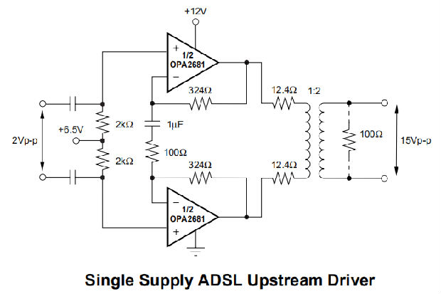 高速放大器的一个非常苛刻的应用是驱动低负载阻抗,同时保持高输出电压到高频。利用双电流反馈运算放大器OPA2681,可以实现15Vp-p输出信号摆成典型阻抗为100Ω的双绞线。配置如首页所示,OPA2681的两个放大器以推挽配置驱动输出变压器,从而使每个运放输出的峰峰值信号摆幅加倍至15Vp-p。变压器的匝数比为2。为了提供匹配的源,这需要一次侧的25Ω源阻抗(RS),给定变压器方程n2=RL/RS。在输出之间平均分配该阻抗需要在每个输出端12.4Ω处安装一个串联终端匹配电阻器。取25Ω的总电阻负载(用于差分输出信号)并在输出电压和电流限制图上画一条负载线,可以看出,在150mA的正峰值电流下需要1.5V的净空,而在150mA的负峰值电流下需要2.5V的净空。通过将直流工作点正0.5V移到6.5V,每个放大器的7.5Vp-p全部通过一个+12V电源实现,如首页ADSL上游驱动器所示。