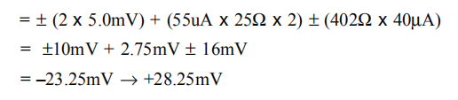 像OPA2681这样的电流反馈运算放大器在高增益下提供了卓越的带宽,提供了快速的脉冲稳定,但只有中等的直流精度。典型的规格显示了一个输入偏置电压可与高速电压反馈放大器相媲美。然而,两个输入偏置电流有点高,是不匹配的。虽然偏置电流抵消技术对大多数电压反馈运算放大器非常有效,但它们通常不会降低宽带电流反馈运算放大器的输出直流偏移。由于两个输入偏置电流的大小和极性都是不相关的,匹配每个输入端的源阻抗以减少它们对输出端的误差贡献是无效的。使用最坏情况+25°C输入偏移电压和两个输入偏置电流评估图1的配置,得出最坏情况下的输出偏移范围等于: