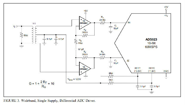 图3显示增益为+10差分输入/输出单电源ADC驱动器。使用像OPA2681这样的双放大器有助于减少必要的板空间,因为它也减少了所需的旁路元件的数量。从信号的角度来看,双放大器提供了优良的性能匹配,例如增益和相位匹配。图3所示的差分ADC驱动电路利用了这一点。变压器将单端输入信号转换为低电平差分信号,该差分信号应用于OPA2681中两个放大器中每个放大器的高阻抗非反相输入。根据方程式G=1+2RF/RG,逆变输入之间的电阻器RG控制该电路的交流增益。显示电阻值后,交流增益设置为10。将电容器(0.1μF)与RG串联,可阻断直流通路,使共模电压的直流增益为+1。这使得,以一种非常简单的方式,将所需的+2.5V直流偏压施加到放大器的输入端,这也将出现在它们的输出端。与OPA2681一样,A/D转换器ADS823在单个+5V电源上工作。其内部共模电压通常为+2.5V,相当于OPA2681所需的偏压。在顶部基准(REFT=+3.5V)和底部基准(REFB=+1.5V)之间连接两个电阻器,在其中点处形成+2.5V的电压电平。将其应用于变压器的中心抽头适当地偏置放大器。必须在中心抽头处提供足够的旁路,以使该点保持可靠的交流接地。电阻RS将运算放大器的输出与转换器的电容输入隔离,并用电容CI形成一阶低通滤波器,以衰减一些宽带噪声。该接口将为ADS823提供>150MHz的全尺寸输入带宽。