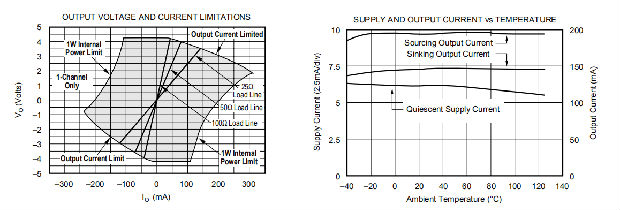 最小规定的输出电压和电流过温是通过最坏情况模拟在极端低温下设定的。只有在冷启动时,输出电流和电压才会降低到保证表中所示的数值。当输出晶体管提供功率时,它们的结温会升高,降低它们的VBE(增加可用输出电压摆幅)和增加电流增益(增加可用输出电流)。在稳态运行中,由于输出级结温高于规定的最低工作环境温度,因此可用输出电压和电流始终大于超温规范中所示的值。