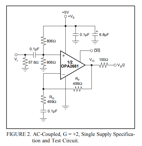 图2显示了交流耦合,+2增益,单电源电路配置,用作+5V规格和典型性能曲线的基础。虽然不是“railto-rail”设计,但与其他非常宽频带电流反馈运算放大器相比,OPA2681需要最小的输入和输出电压余量。它将提供一个3Vp-p输出摆幅单+5V的带宽大于150MHz。宽带单电源运行的关键要求是保持输入和输出信号在输入和输出的可用电压范围内摆动。图2的电路使用来自+5V电源(两个806Ω电阻器)的简单电阻分压器建立输入中点偏置。然后输入信号被交流耦合到这个中点电压偏置中。输入电压可以在任何一个电源引脚的1.5V范围内摆动,在电源引脚之间提供一个2Vp-p输入信号范围。调整用于测试的输入阻抗匹配电阻器(57.6Ω),以在包括偏置分配器网络的并联组合时提供50Ω的输入匹配。增益电阻(RG)是交流耦合的,给电路一个+1的直流增益,这也将输入直流偏置电压(2.5V)施加在输出端。反馈电阻值已从双极供电条件进行调整,以便在+5V、增益为+2的情况下重新优化平坦频率响应(请参阅设置电阻值以优化带宽)。同样,在单个+5V电源上,输出电压可以在任何一个电源引脚的1V范围内摆动,同时提供超过75mA的输出电流。要求100Ω负载到中点偏压在这个特性化电路中使用。在第三级输出中,81级输入的双极性电流失真最小。