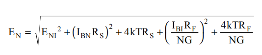 将该表达式除以噪声增益(NG=(1+RF/RG))将得到非逆变输入下的等效输入参考点噪声电压,如等式5所示。