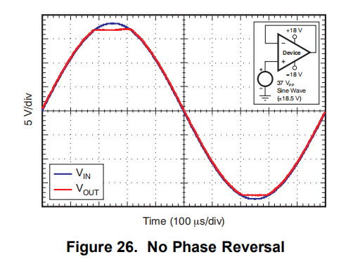 OPAx180系列具有内部相位反转保护。当输入被驱动超过其线性共模范围时,许多运算放大器都会出现相位反转。这种情况在非换向电路中最常见,当输入被驱动到超过规定的共模电压范围时,导致输出反向进入相反的轨道。OPAx180的输入可防止共模电压过高时的相位反转。相反,输出限制在适当的轨道上。这种性能如图26所示。