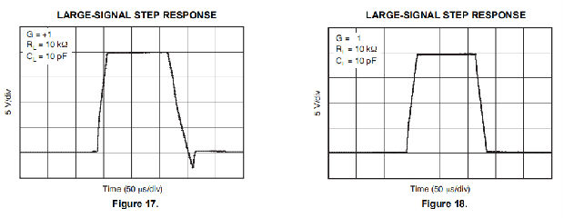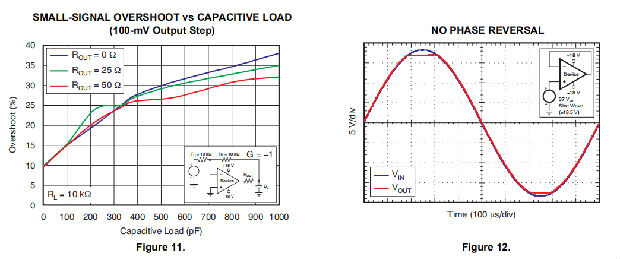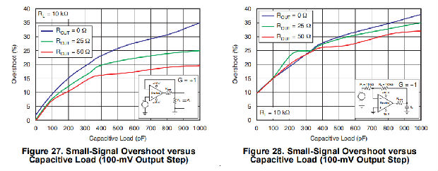 OPAx180的动态特性已针对一系列常见操作条件进行了优化。低闭环增益和高容性负载的结合降低了放大器的相位裕度,并可能导致增益峰值或振荡。因此,较重的电容性负载必须与输出隔离。实现这种隔离的最简单方法是在输出端串联一个小电阻(例如,ROUT等于50Ω)。图27和图28显示了几个ROUT值的小信号超调与电容性负载的关系图。此外,有关分析技术和应用电路的详细信息,请参阅应用报告,反馈图DefineoPapc Performance(SBOA015),可从TI网站下载。