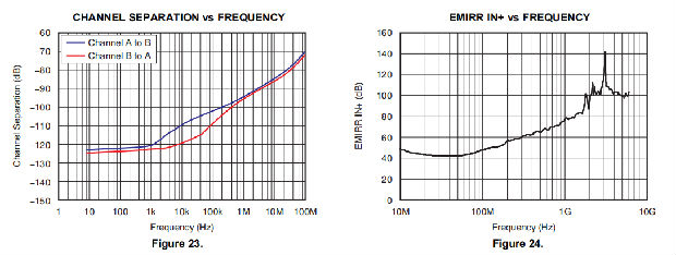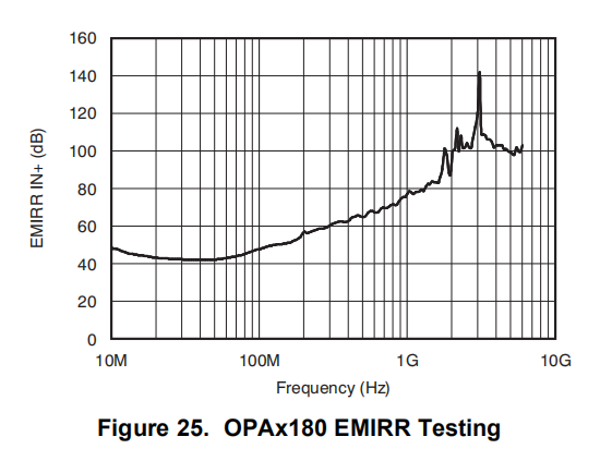 OPAx180使用集成电磁干扰(EMI)滤波来减少来自无线通信和人口稠密的板(混合了模拟信号链和数字组件)的EMI干扰的影响。EMI抗扰度可以通过电路设计技术提高;OPAx180从这些设计改进中受益。德州仪器公司已经开发出能够准确测量和量化运算放大器在从10兆赫到6兆赫的宽频带上的抗扰度。图25显示了在OPAx180上的测试结果。详细信息也可以在应用报告中找到,运算放大器的EMI抑制比(SBOA128),可从TI网站下载。