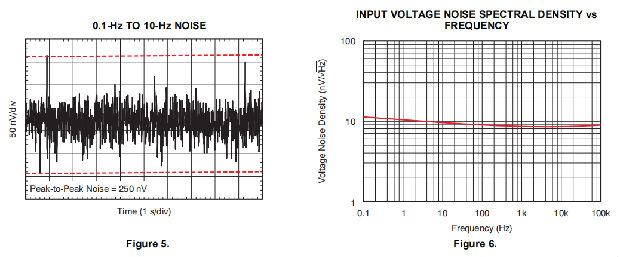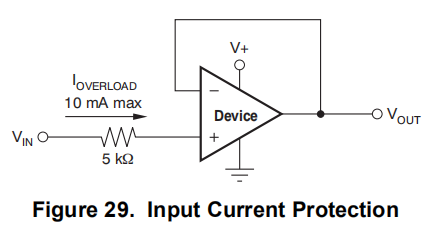 这些ESD保护二极管还提供电路内输入过驱动保护,只要电流限制在10毫安,如绝对最大额定值所述。图29显示了如何在驱动输入端添加一个串联输入电阻来限制输入电流。增加的电阻在放大器输入端产生热噪声,在对噪声敏感的应用中,其值应保持在最小值。
