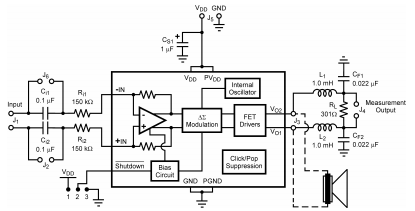 除了应用电路所需的最小零件外,在评估电路板,使传统的音频测量可以方便地进行,而不需要额外的设备。这是一个平衡输入,接地差分输出低通滤波器,3dB频率约35kHz,板上终端电阻为300Ω(见图32)。注意电容性负载元素返回地面。这对于共模抑制来说不是最佳的,但是由于独立的脉冲格式在每个输出端都有大量的高频共模输出上的组件。接地电容滤波器元件将电路板上的该元件衰减至降低对分析仪器的高频共模抑制比要求。即使使用接地滤波器,音频信号仍然是差分的,因此需要对任何分析进行差分输入与之相连的仪器。大多数实验室仪器的输入端带有BNC连接器,它们是不差分的因为BNC的环通常是接地的。常用的音频精度分析仪是差分的,但它能够准确地拒绝快脉冲350ns的宽度值得怀疑,因此必须安装车载测量滤波器。当有疑问或信号需要单端,使用音频信号转换器将差分输出转换为单端输出。根据音频转换器的特性,音频信号可能会有一些衰减为了正确衡量绩效,需要考虑这些因素。在测量滤波器的输出端进行的测量相对于未经滤波的主滤波器受到衰减即使是音频输出。这是由于与终端相互作用的电感器的电阻造成的电阻器(300Ω),通常约为-0.25dB(3%)。换句话说,电压水平(和相应的功率通过测量过滤器显示的水平略低于负载时的实际值放在未过滤的输出上。测量用滤波器中的这个小损耗给出了较低的输出功率读数比实际发生在未过滤的输出及其负载上的情况。