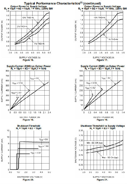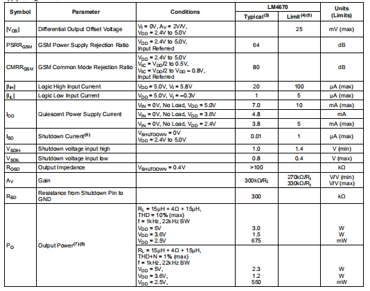 (7) 典型的输出功率数适用于ITL(DSBGA)封装中的LM4670。在WSON(SDA)包中,输出功率将为由于从IC输出焊盘到PCB迹线的电阻更高,所以较低。随着阻抗负载的降低,这种差异增大。
