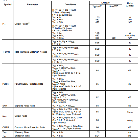 以下规格适用于AV=2V/V(RI=150kΩ),RL=15μH+8Ω+15μH,除非另有规定。限制适用于TA=25°C。