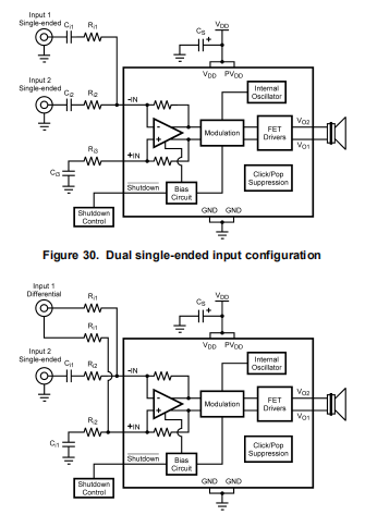 LM4670还可以使用单端和差分源的组合。一个典型的应用程序单端源和一个差分源如图31所示。利用叠加原理外部组件值可由上述与配置相对应的方程式确定。