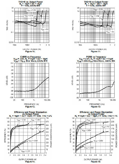 一般来说,效率被认为是有用功输出除以所需总能量的比率产生它的差别是功耗,通常在集成电路中。这里的关键是“有用”的工作。为音频系统,在可听见的频带中传输的能量被认为是有用的,包括输入信号。亚音速(DC)和超音速分量(>22kHz)不起作用。两者之间的区别来自电源的功率和被转换的音频频带功率在LM4670和传感器负载。LM4670的功耗非常低。这是因为用于形成输出波形的开关的导通电阻通常小于0.25Ω。这个离开了只有传感器负载作为潜在的“汇”为输入功率超过音频带输出功率的一小部分。LM4670只消耗一小部分的多余功率,不需要额外的PCB面积或铜平面充当散热片。
