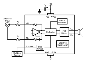 随着模拟电压的不断缩小,设计人员正在不断缩小数字信号在限制电压摆动的情况下保持信噪比。LM4670是一个完全不同的具有差分输入和输出级的放大器。差分放大器放大两个输入信号。传统的音频功率放大器通常只提供单端输入相对于差分输入,信噪比降低了6分贝。LM4670还提供了直流输入耦合,消除了两个外部交流耦合,直流闭锁电容器。LM4670可以然而,作为一个单端输入放大器使用,同时仍然保留其完全不同的优点。事实上,完全无关的信号可以放在输入引脚上。LM4670只是放大了这种差异在信号之间。差分放大器的一个主要优点是提高了共模抑制比(CMRR)在单输入放大器上。差分放大器的共模抑制特性降低对地面偏移相关噪声注入的敏感性,在高噪声应用中尤其重要。