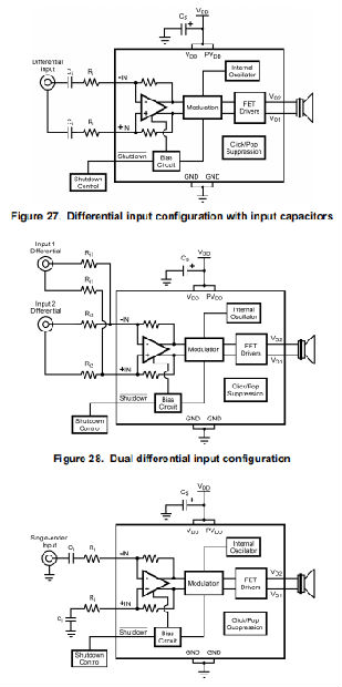LM4670可用于多种不同的电路配置。最简单、性能最好的是DC耦合的差分输入配置如图26所示。上面的等式2用于确定国际扶轮社所需增益的电阻器。输入电容器可以在图27所示的差分配置中使用。上面的等式3用于确定Ci电容器的值,以获得期望的频率响应,这是由Ci和Ri。上面的等式2用于确定Ri的值所需增益的电阻器LM4670可用于放大多个音频源。图28显示了一个双差分输入配置。每个输入的增益可以使用Ri独立设置,以获得最大的设计灵活性每个输入和方程式2的电阻。输入电容器可用于一个或多个电源,以及不同的频率响应取决于电源或直流电压是否需要与电源阻断。