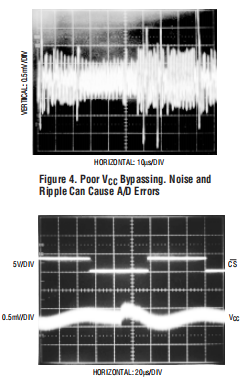 为了获得良好的性能,VCC必须没有噪音和涟漪。有关VCC电压的任何变化在转换周期内接地可能会导致错误或输出代码中有噪音。VCC噪声和纹波可以保持通过将VCC引脚直接旁路至具有至少22μF钽电容器的模拟平面尽可能短的引线。来自VCC电源的设备也应保持在最低限度VCC电源的输出阻抗应该很低